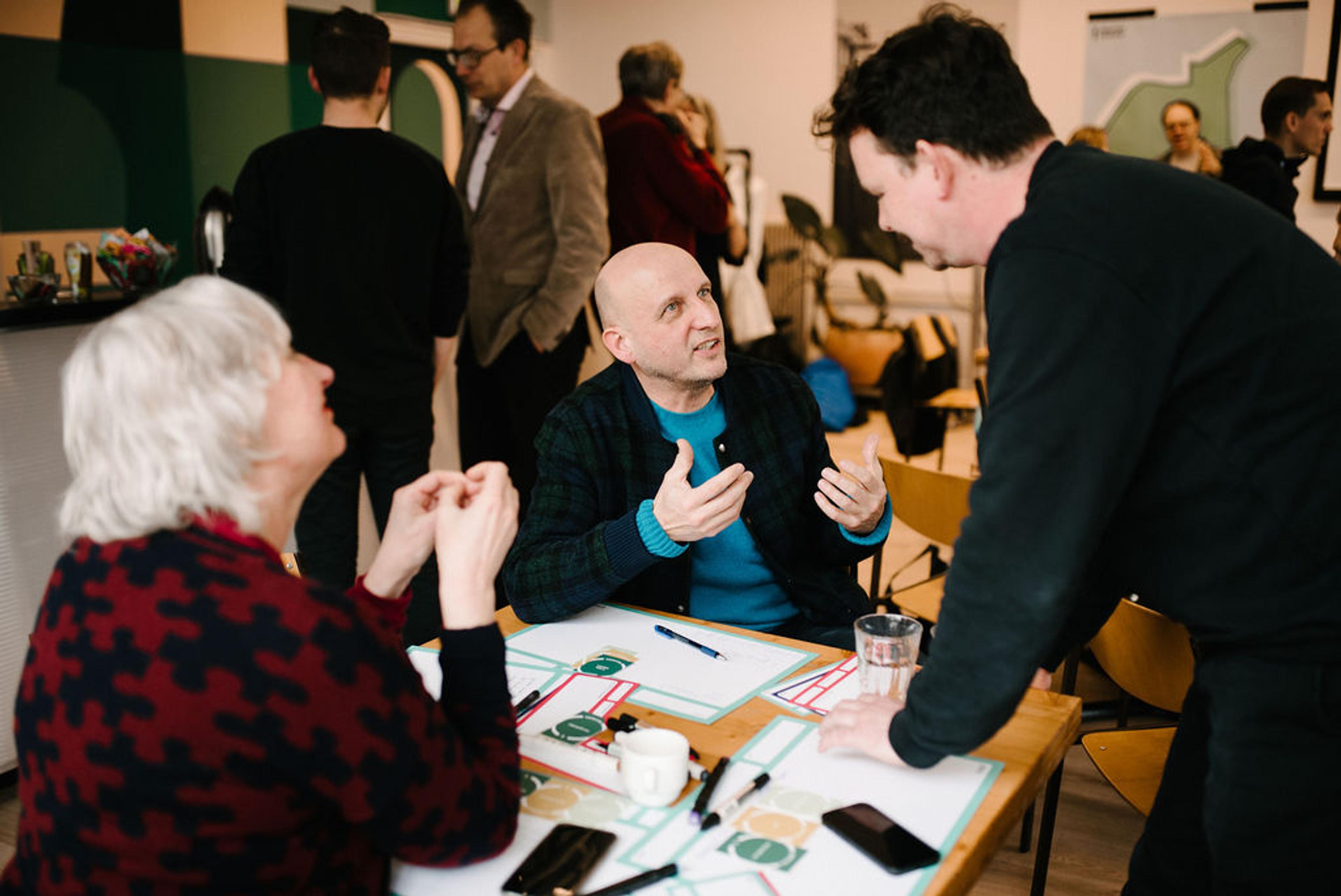 Al gauw was het tijd voor wat actie. De aanwezigen werden uitgenodigd om in slechts twee minuten hun energieopwekkende ideeën voor festivalterrein Stadsblokken/Meinerswijk te schetsen. Onder begeleiding van een hilarisch circusmuziekje werd er al gauw druk getekend.